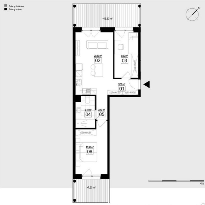 To mieszkanie oferuje funkcjonalny układ z wyraźnym podziałem na strefę dzienną i prywatną. W centrum znajduje się salon połączony z aneksem kuchennym, z którego prowadzi wyjście na duży balkon. Jeden z pokoi ma bezpośredni dostęp do tej samej przestrzeni na świeżym powietrzu. Przedpokój został zaprojektowany tak, by pomieścić pojemne szafy w zabudowie. Łazienka jest przestronna i ustawna, co ułatwia jej aranżację. Główna sypialnia znajduje się w oddalonej części mieszkania, oferując prywatność oraz własny, niezależny balkon skierowany na południowy wschód.
