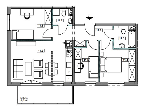 To przestronne mieszkanie zostało zaprojektowane z myślą o wygodzie całej rodziny. Centralną część stanowi jasny salon połączony z otwartą kuchnią, co tworzy dużą, wspólną przestrzeń do spędzania czasu razem. Z tego pomieszczenia jest wyjście na balkon, idealny na chwilę relaksu na świeżym powietrzu. Przedpokój jest szeroki i daje możliwość zamontowania pojemnej szafy w zabudowie, co ułatwi utrzymanie porządku. W mieszkaniu znajdują się trzy oddzielne sypialnie, które można urządzić jako pokoje dla dzieci, gabinet czy sypialnię główną z miejscem na duże łóżko i szafę. Do dyspozycji są dwie osobne strefy sanitarne – łazienka oraz dodatkowe WC, co zdecydowanie zwiększa komfort codziennego użytkowania, zwłaszcza przy większej liczbie domowników.